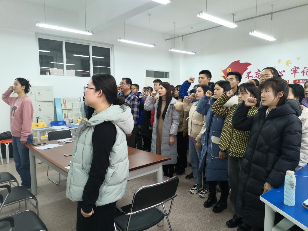 仪式在奏唱国际歌开始,张晓娟宣读了预备党员名单并表示祝贺,正式党员为预备党员佩戴党徽后,在张静怡的领誓下,全体党员面对党旗进行了庄严宣誓。预备党员代表张植淋发言,向党组织表明决心,要努力学习,奋发进取,扎实工作,用实际行动践行誓言。雒进才对预备党员提出了几点要求与期望,强调要进一步纯洁入党动机,要加强理论学习,加强党性修养,提高自身素质,坚定为党、国家和人民的教育事业奋斗终身的理想信念,一定要在今后的学习生活和工作中起到先锋模范带头作用。最后在奏唱中华人民共和国国歌后宣誓仪式圆满结束。