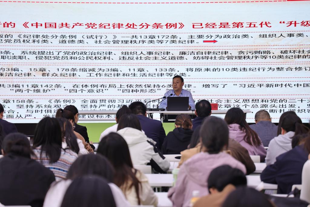 殷大斌从回顾《条例》的发展历程、修订的重大意义、修订的主旨要义、修改的主要内容以及抓好《条例》的贯彻执行五个方面展开,结合典型的违纪行为、案例实例进行讲解、阐释、剖析,帮助党员、干部全面深入领会《条例》的精神实质,准确把握《条例》的实践要求。殷大斌指出,要让党员、干部切身感受到党的严管和厚爱,始终做到忠诚、担当、干净,在从严治党要突出责任上全链条、管理上全周期、对象上全覆盖的全方位管理和经常性监督。