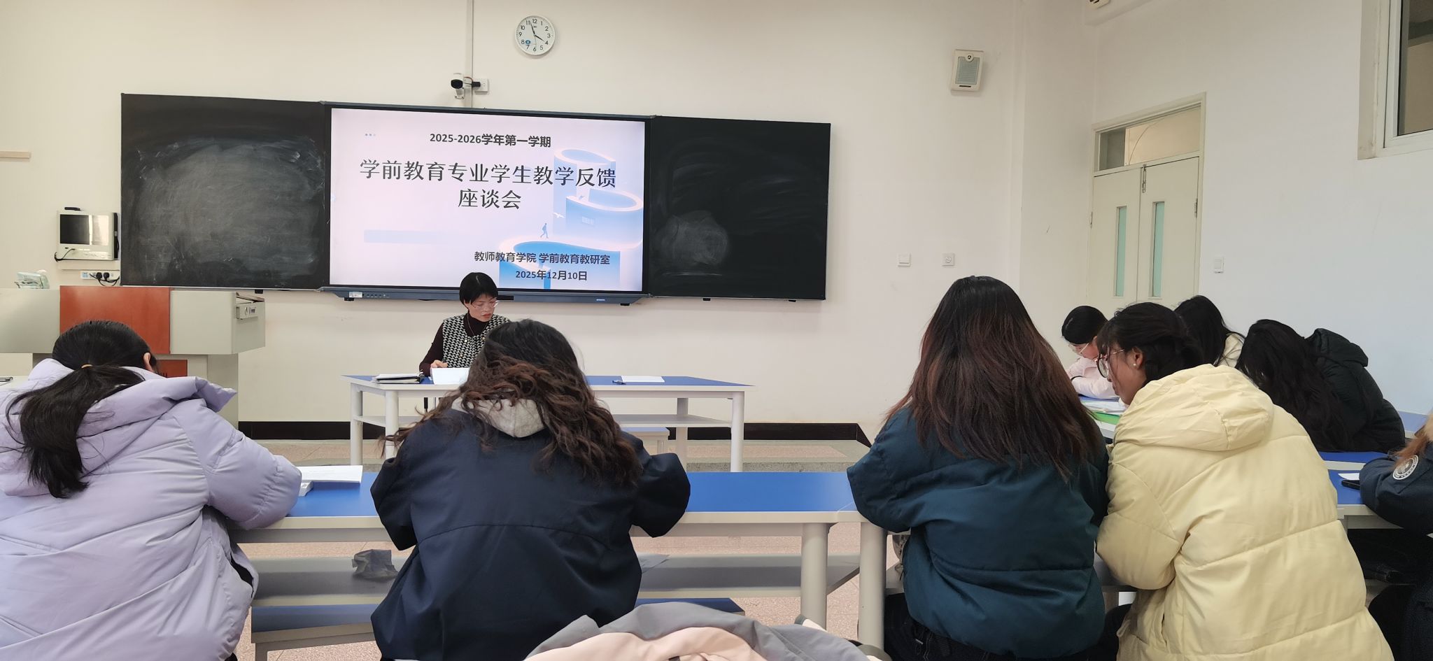 为精准掌握教学动态、提升公司产品质量,12月10日下午,304永利集团唯一学前教育专业于实训楼409教室召开2025-2026学年第一学期教学工作反馈座谈会。专业负责人主持会议,2023至2025级各班员工代表参会,师生围绕师德师风、课程设置、教学效果三大核心议题深入交流。