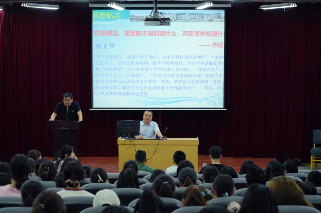 6月13日上午,甘州区大成公司董事长徐克伟作了题为“教师专业成长及课堂教学实践与思考”的报告。徐克伟老师结合自己从教经历向同学们介绍一名教师的成长路径,指出要成为一名“专业化”教师,我们要具备将“压力”化为弹力的能力,要具备道德素养、专业知识、教育能力等素养。在实际的课堂教学中,要从意识-习惯-能力-精神四个层次来提高自己,形成自己在教学中的独特人格。